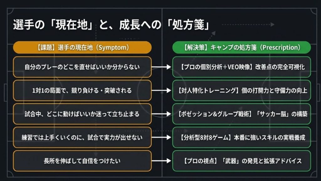- 「1対1の局面で、いつも競り負けたり突破されたりしてしまう」 → 対人スキル特化のトレーニングで、個の打開力と守備力を磨きます。
