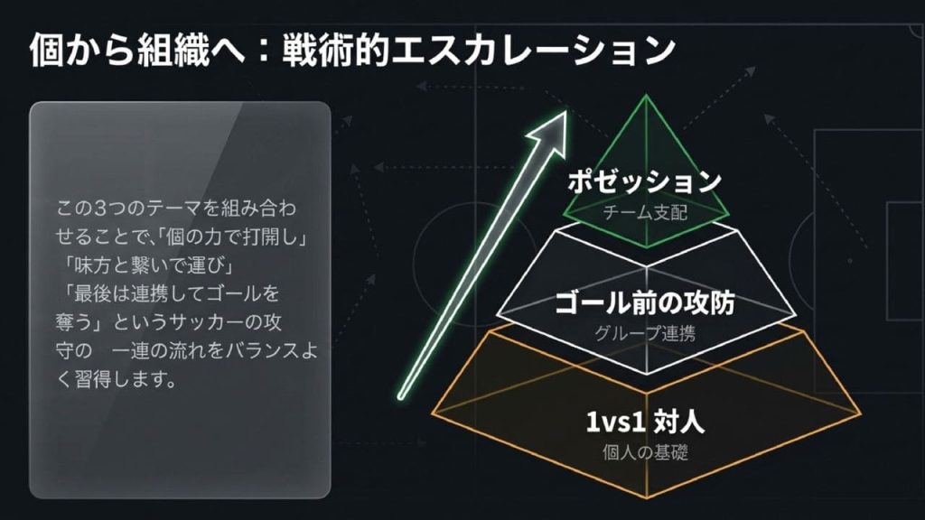 「1vs1で負けない対人スキル」と「グループで攻撃・守備を行う戦術スキル」「ボールを失わないポゼッションスキル」で状況判断の質を高めます。