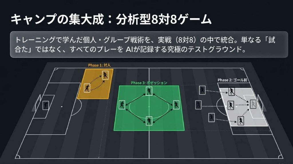 トレーニングで学んだ個人戦術・グループ戦術を、実戦(8対8)の中で試します。