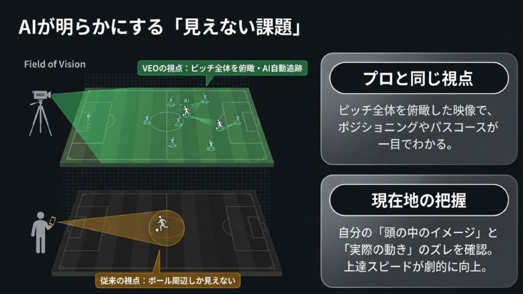 - プロと同じ視点:AIがボールを自動追跡。ピッチ全体を俯瞰した映像で、自分のポジショニングやパスコースが一目でわかります。