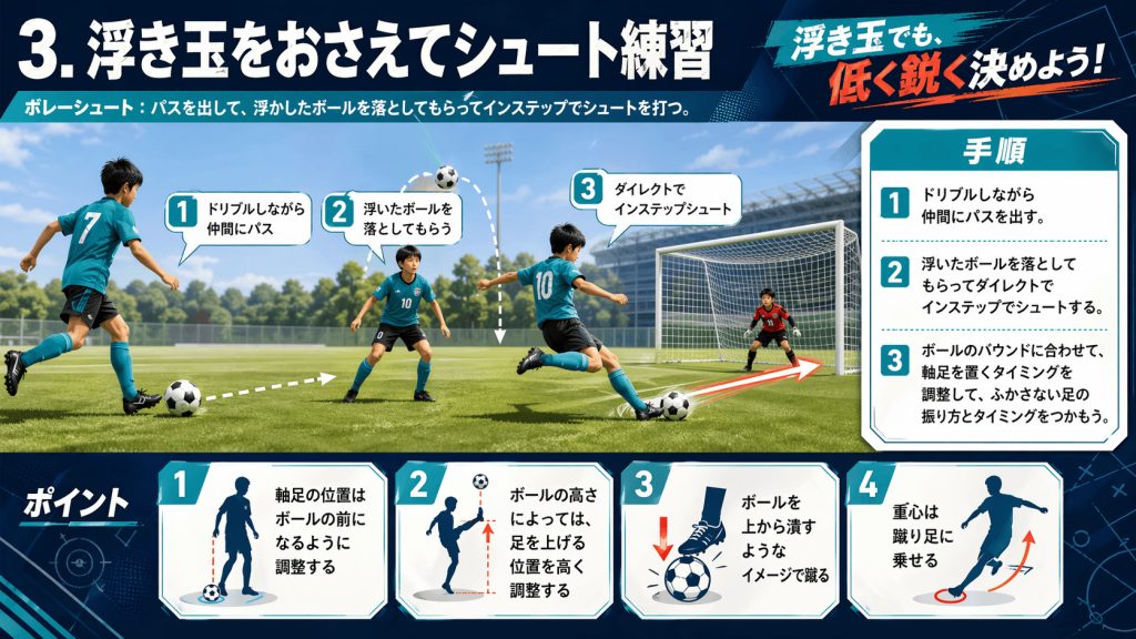 浮いたボールを落としてもらってダイレクトでインステップでシュートする。
