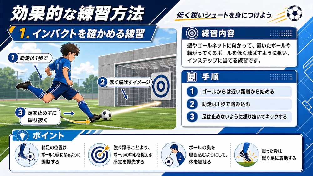 シュートを打つ時に、いつもよりも自分に近い位置でインパクトさせます。ボールの芯を足の甲全体で押し潰すように叩くと、低く鋭いシュートになります。足を途中で止めないようにゴールに向かって足を振り抜くことも意識しましょう。