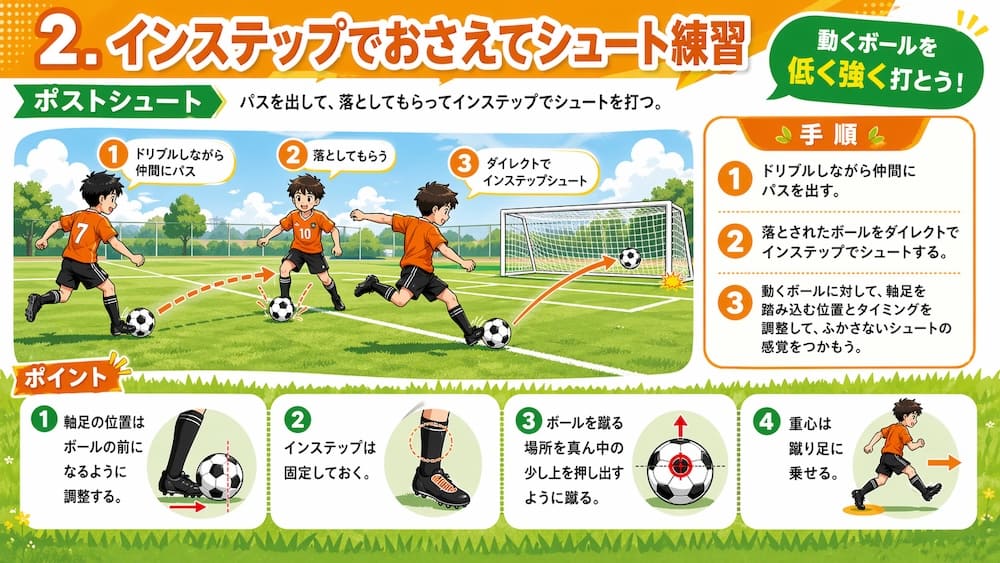 • ポストシュート: パスを出して、落としてもらってインステップでシュートを打つ。